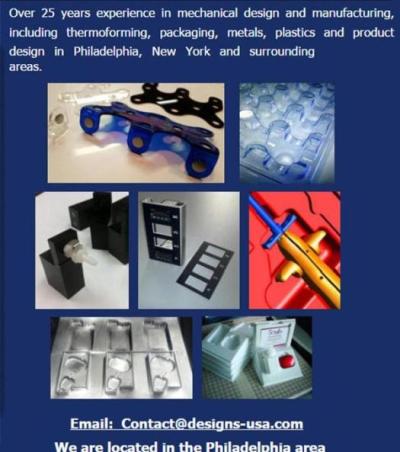 Thermoforming prototypes, Design and production in the Philadelphia area. Low volume production of thermoformed / vacuum form parts. Structures for counter displays, blisters, handling trays and clamshell packages. Our customers: Toys, consumer electronics, tools, dental device packaging, Medical device trays, diagnostic kits, cosmetic / perfume trays , automotive, OTC pharmaceutical product packages, retail display packaging. Molds created with CAD CNC 3D software and equipment. CNC machined plastic parts. CNC thermoform tooling. Rendered drawings and documentation in PDF, STP DXF, etc. A typical project completed in a week or two. Sooner if you need it. Costs range from $600 - $2000. We can have production quality parts in your hands in a week! View samples of our work at www.Designs-USA.com email contact@designs-usa.com