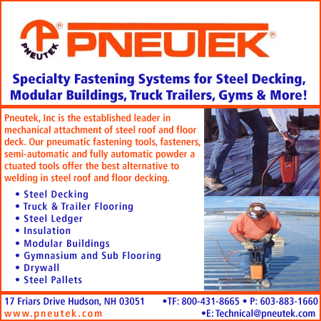Pneutek, Inc. is the established leader in mechanical attachment of steel roof and floor decks. Pneutek is a manufacturer of pneumatic and powder actuated fastening systems and tools which includes semi-automatic & fully automatic tools for the attachment to steel decking, modular construction, drywall construction, truck & trailer flooring, gymnasium and sub flooring, steel ledgers and pallets.